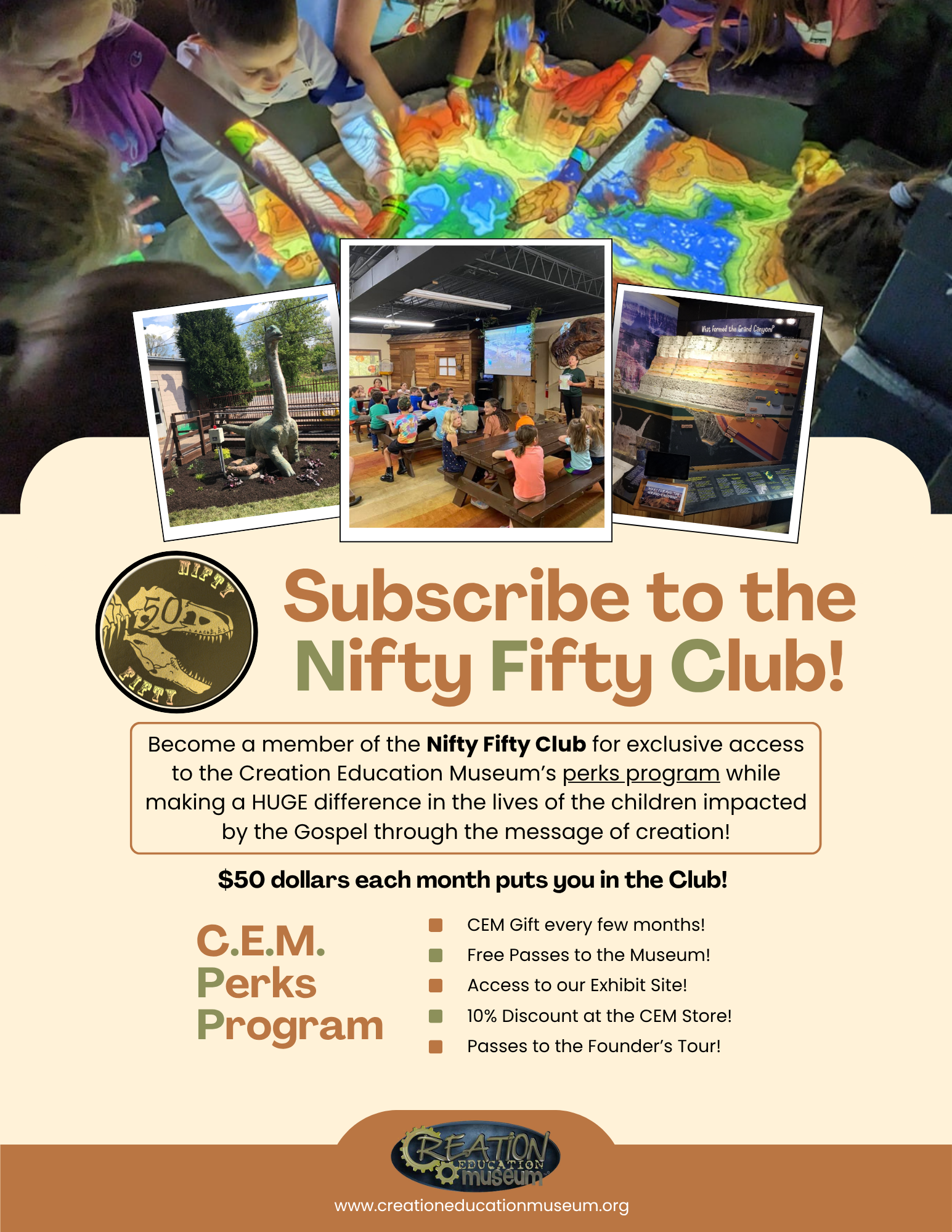 A: The Nifty Fifty is our monthly giving perks program that is designed to thank the dedicated supporters of the Creation Education Museum with exclusive benefits while ensuring ongoing support for the mission of the Creation Education Museum in Copley, Ohio. Donors who contribute monthly receive periodic perks for being faithful in their support of CEM.Q: How does my monthly donation help?