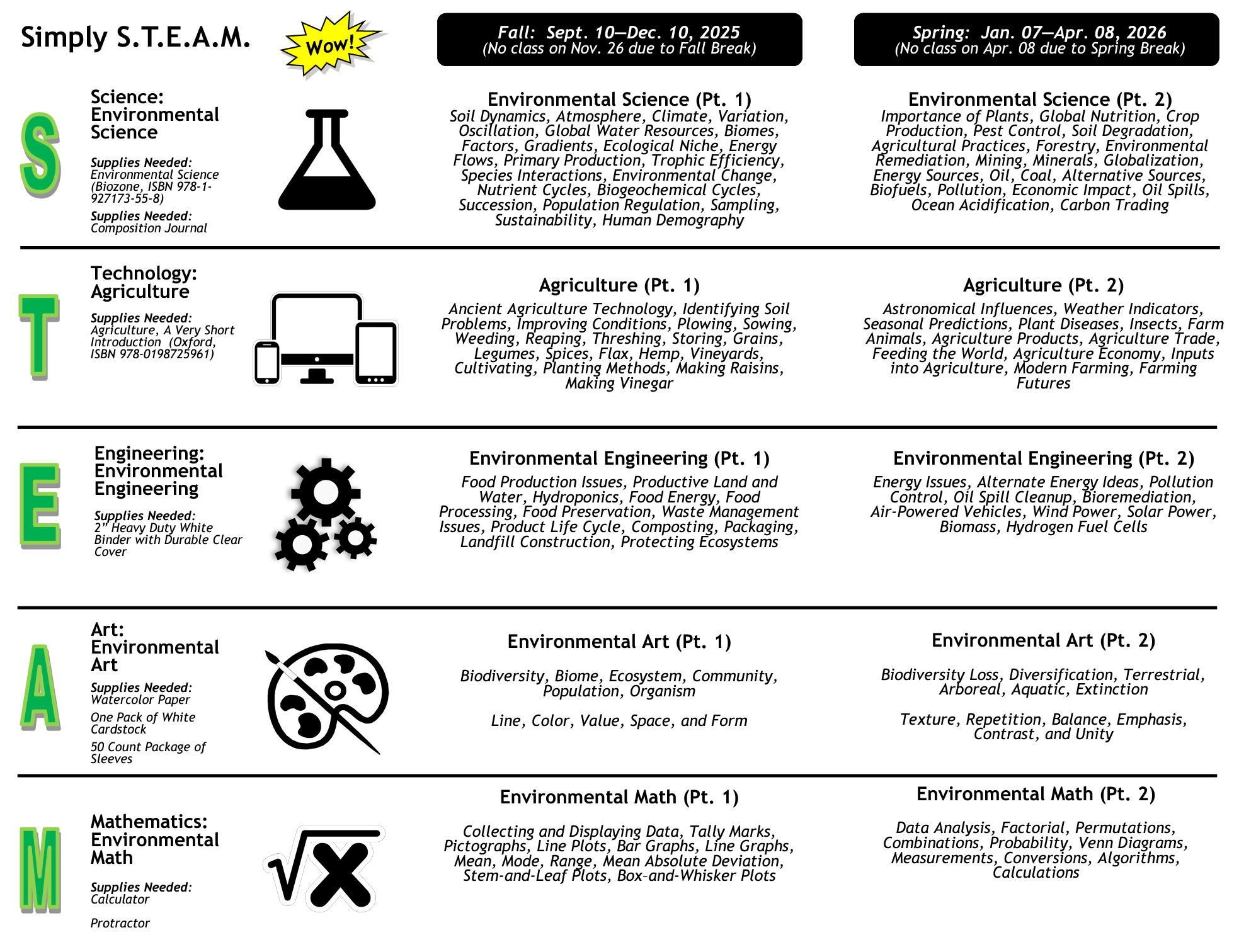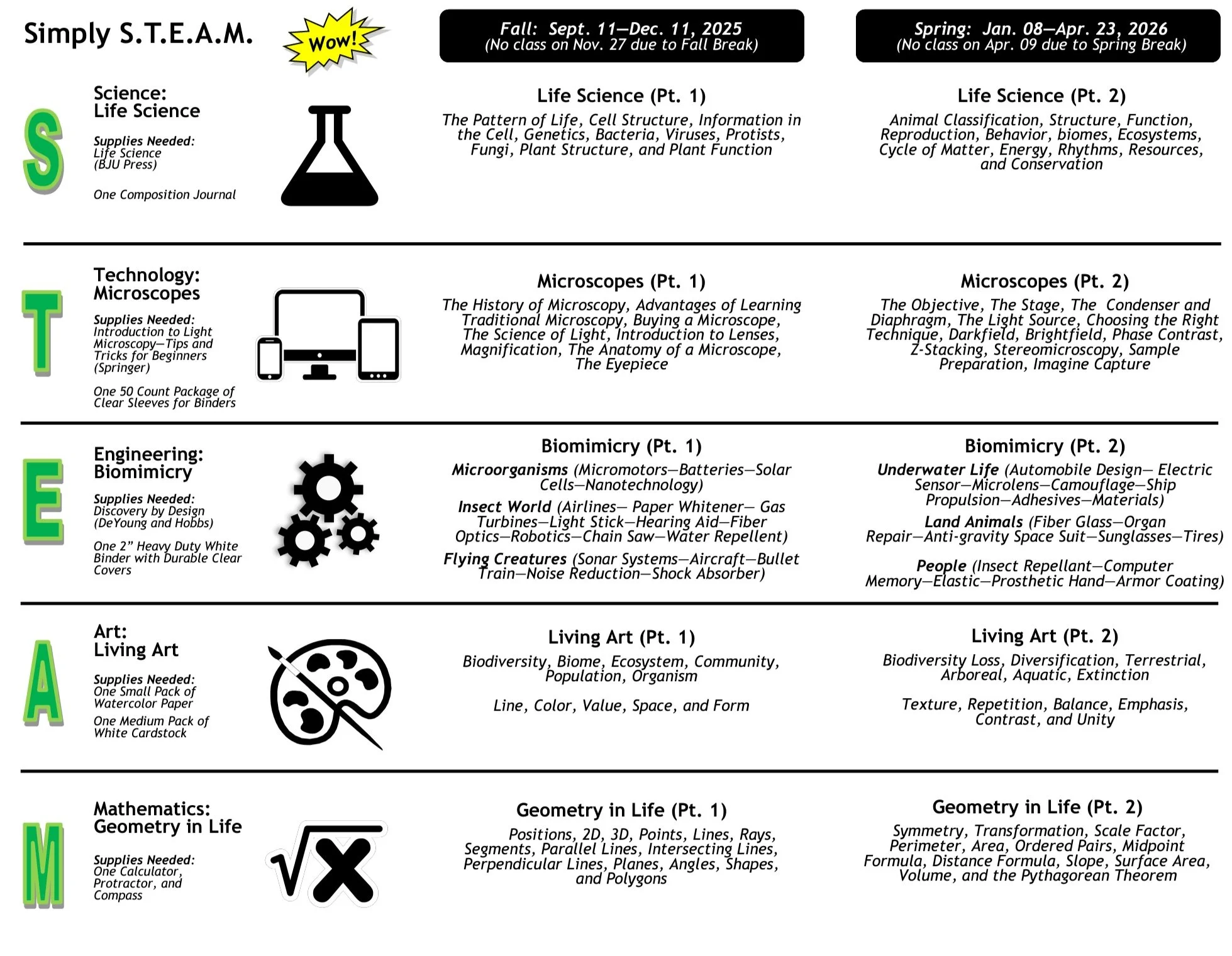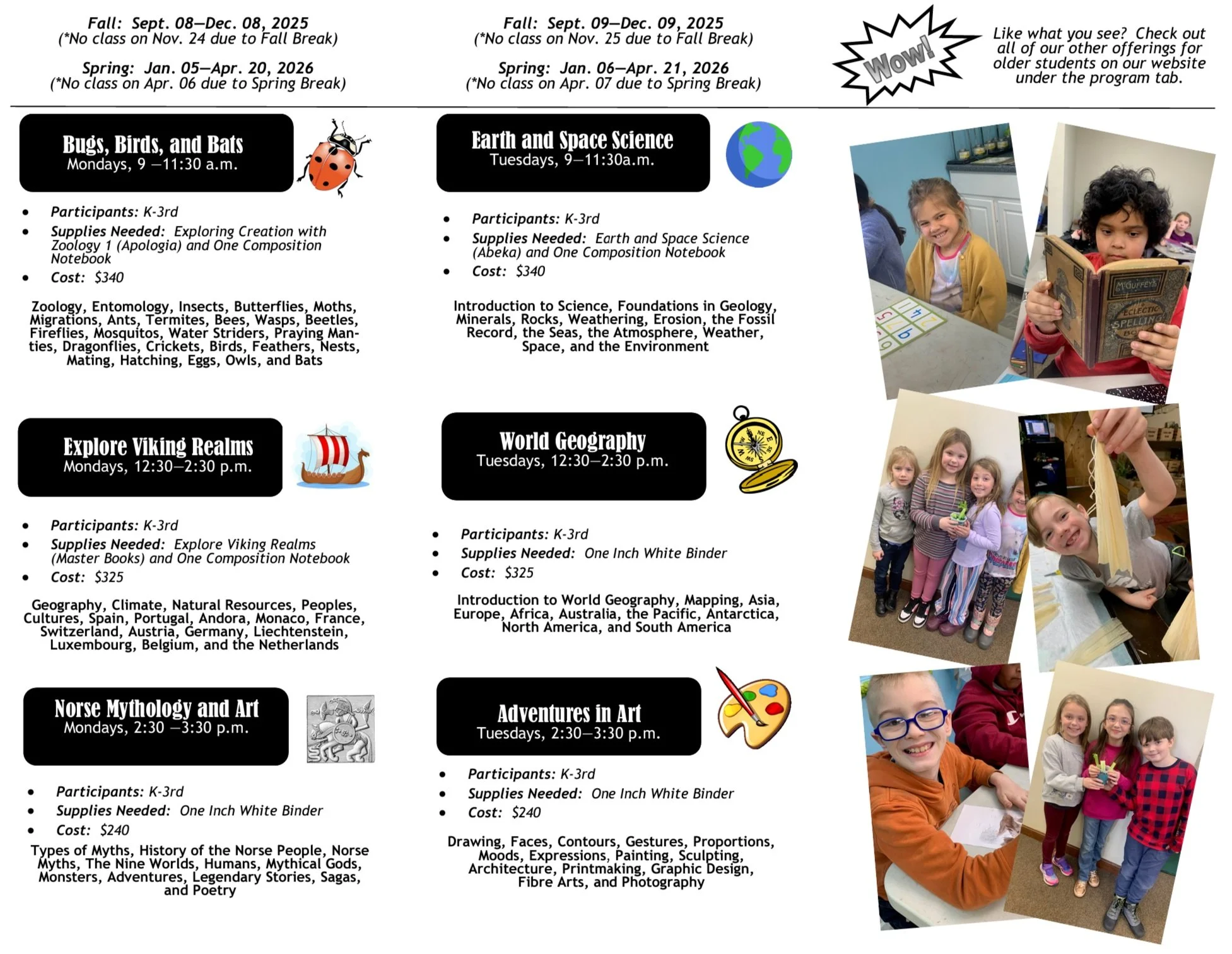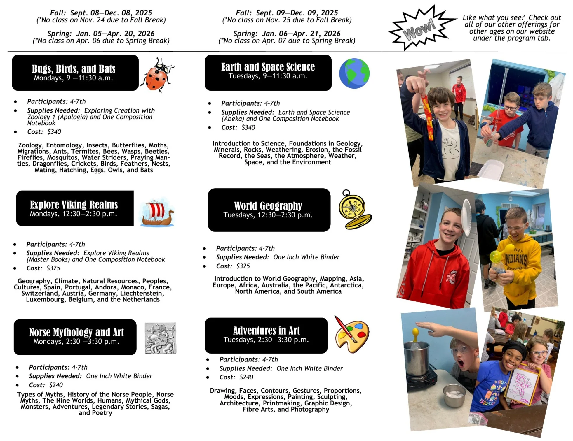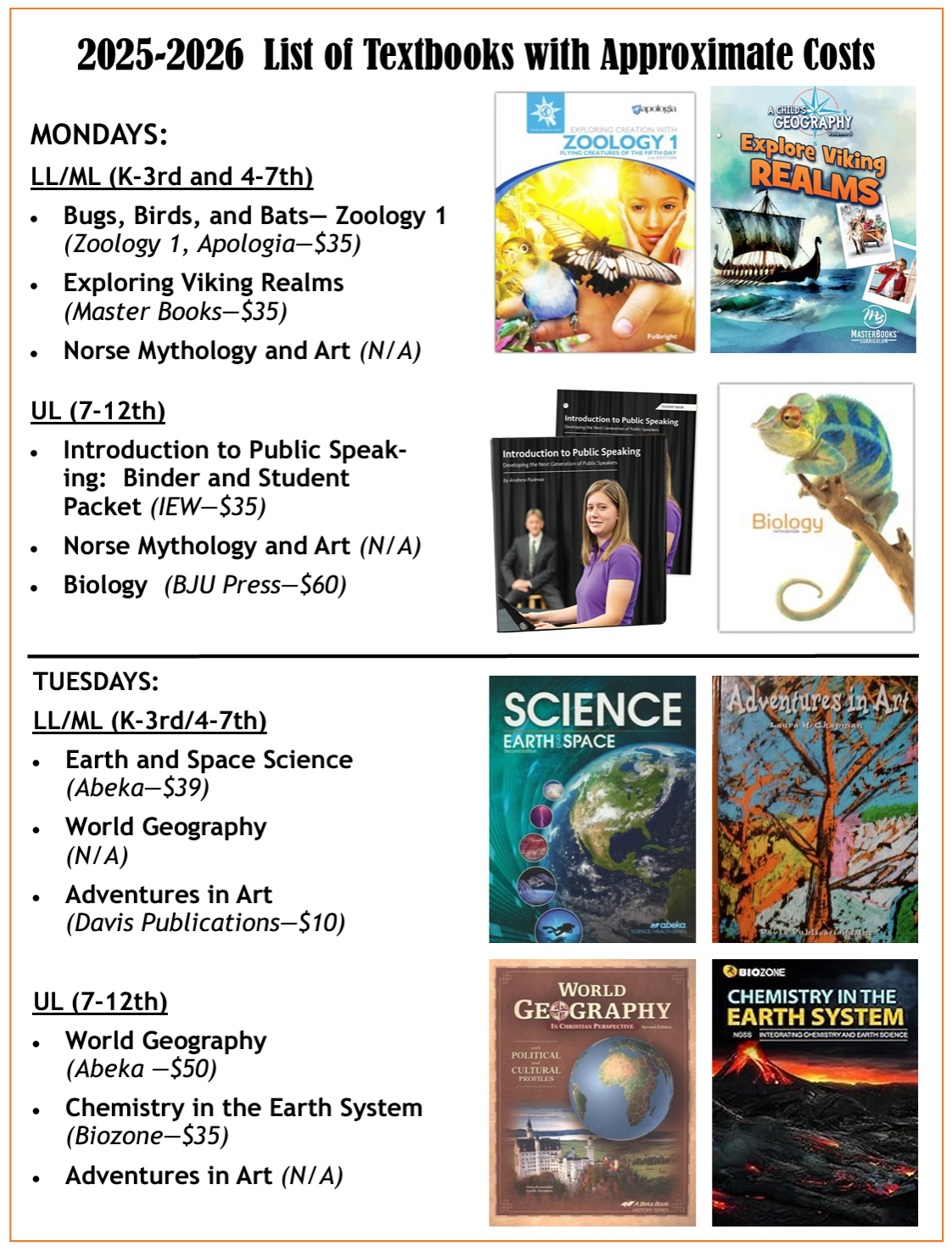 Below you will find a list of the necessary textbooks for each class, followed by a copy of each Class level’s brochure. Please scroll until you reach the heading that matches your chosen course(s). Each class listing will include supplies needed such as binders, notebooks, etc. *Composition notebooks must have sewn-in, non-perforated pages. They may be wide-ruled or college-ruled.